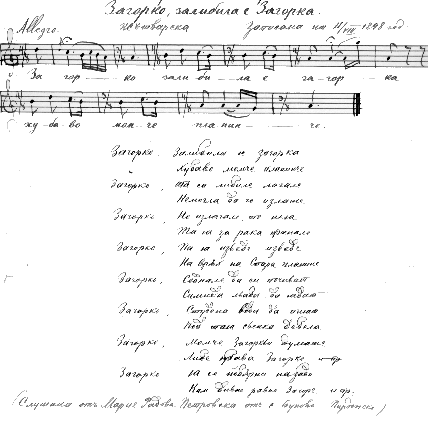 Загорко, залибила е загорка\Загорко\ Залибила е Загорка хубаво момче планинче,\Загорко\ та са либиле,либиле, не могла да го излаже,
