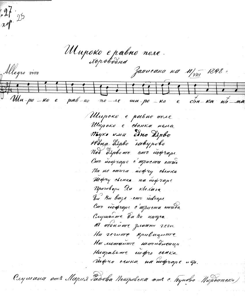 Широко е равно полеШироко е равно поле,широко е - сянка няма.Туко има едно дърво,едно дърво йавурово
