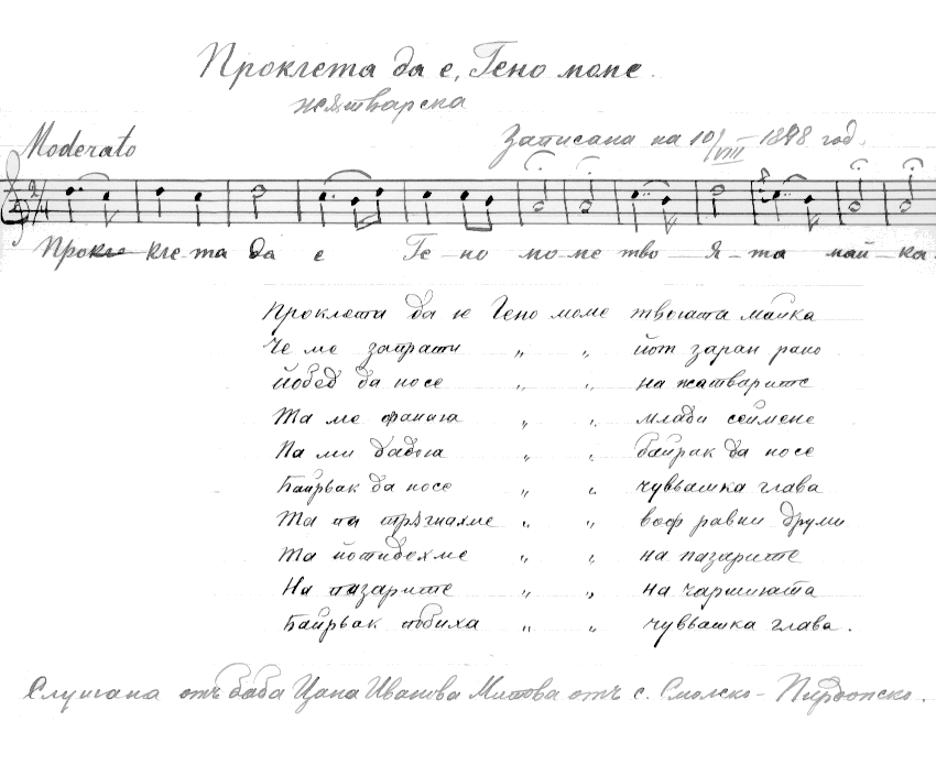 Проклета да е Гено моме твоята майкаПроклета да йе (Гено моме+) твоята майка,че ме запрати йотзаран рано,йобед да носе на жатварите