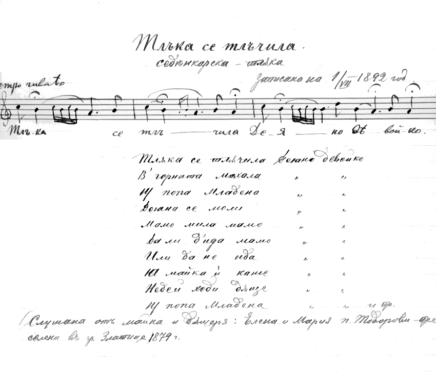 Тлака се тлачилаТлъка се тлъчила(Деяно, девойко+),в горната махалайу попа Младена.Деяна се моли:- Мамо, мила мамо,