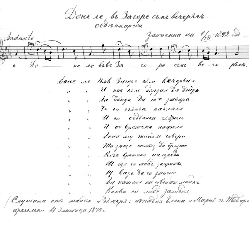Доне ле във Загоре съм вечерял/а/ (Доне ле!+) /е/ Във Загоре съм вечерял и пак съм бързал да дойда, да дойда, да те завара, че си огъня наклала