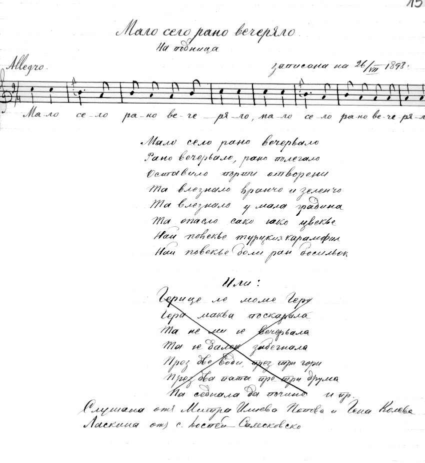 Мало село рано вечерялоМало село рано вечеряло, /2/рано вечеряло, рано полегало,оставило порти отворени,та влезнало вранчо и зеленчо,та опасло сако яко цвекье