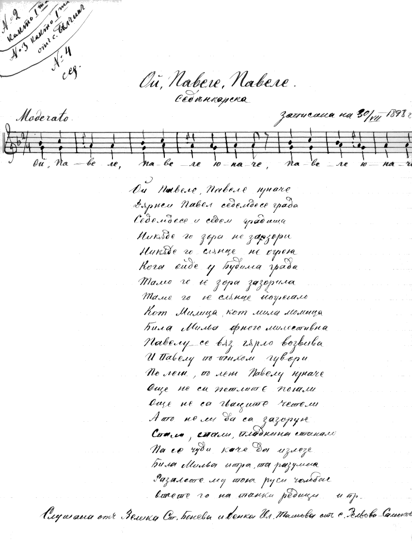 Ой Павле Павле юначеОй, Павеле, Павеле юначе, Павеле юначе!Държи Павел седемдесе града,седемдесе и седем градища,никъде го зора не зазори,никъде го слънце не огрея