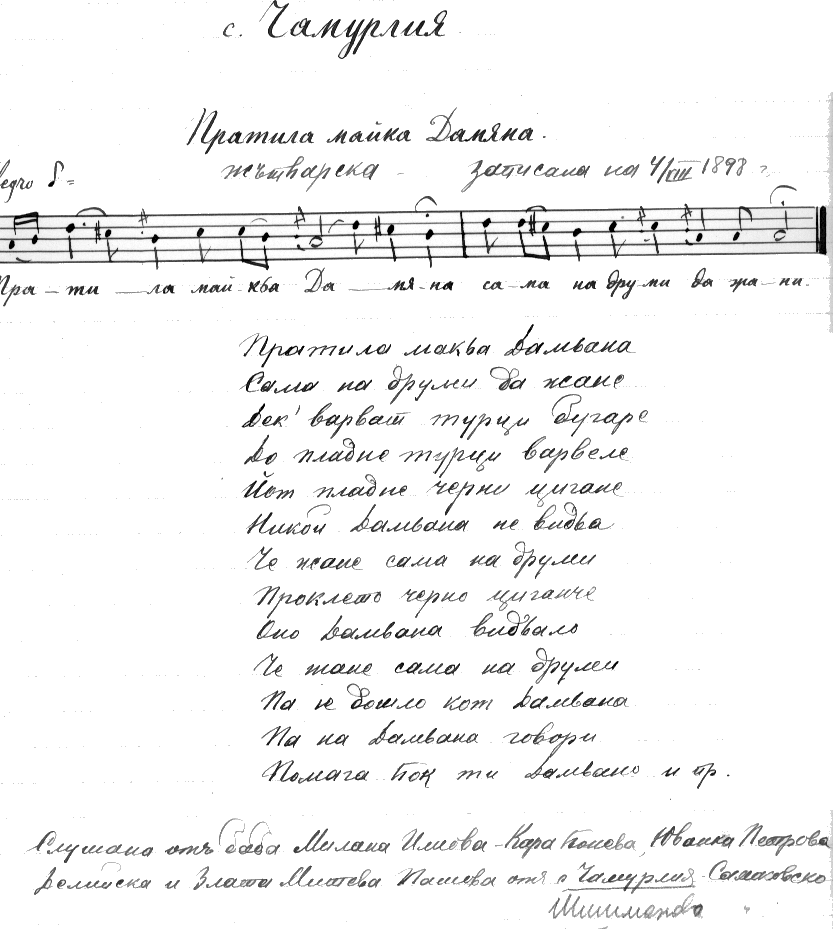 1.песен /ан.-оп.РН гр.ПКЛ/с. Шишманово /Чамурлии, Чамурлия/ Самоковско Сф СрЗБЗвр:Хроматичен тетрахордИцф:ла-1 си бем.-1 ла-1Тмп:Allegroбаба Милана Илиова Карабонева,Юванка Петрова Делийска иЗлата Митева Пашова |