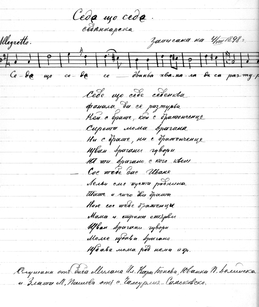 Седя що седя седянкаСеде, що седе седенка,фанала да са разтуря.Кой с брате, кой с братонченце,сирота мома Драгана,ни с брате, ни с братонченце.Йуван Драгани гувори
