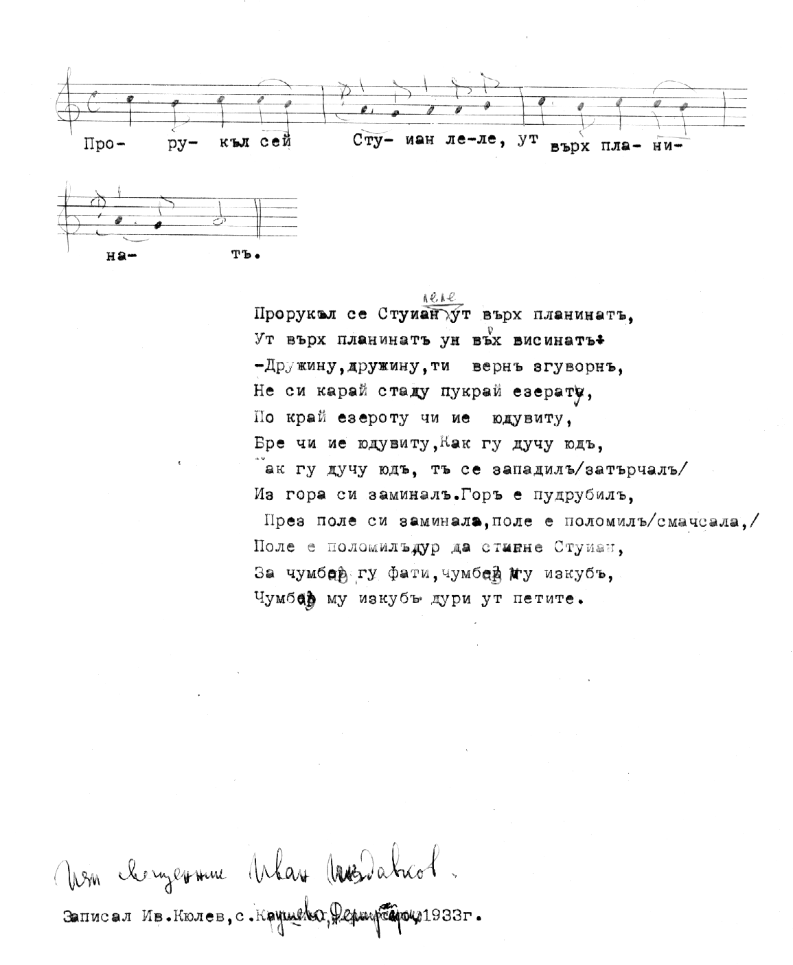 Прорукъл се Стоян мори от връх планинатаПрорукъл сей Стуян (леле+) ут върх планинатъ,ут върх планинатъ (лиле+) ут върх висинатъ,