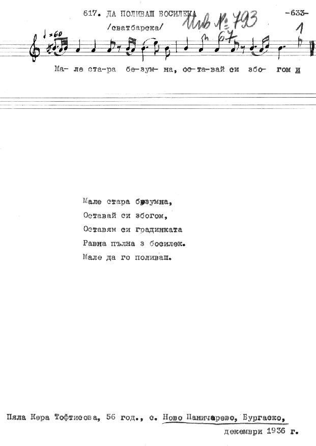 Мале ле стара безумнаМале ле,стара безумна,оставай си збогом /и/оставям си градинката,равна пълна с босиляк,мале да го поливаш.